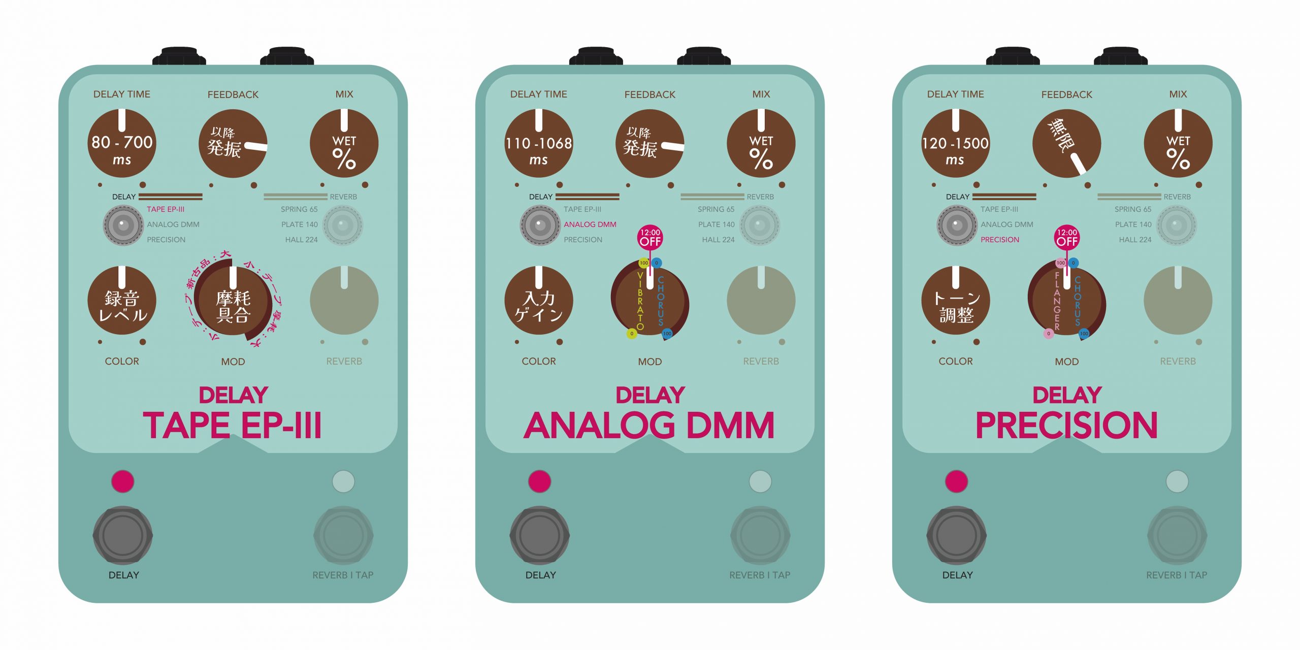 音質が激しく良い、のはもちろんなのですが、アナログ風、デジタル風、どちらもいけますし、シンプルなディレイからぶっ飛んだセッティング、ショートディレイでフィードバックもカラーも控えめにすると MOD つまみでヴィブラート風、コーラス風、フランジャー風にもなる、さらには狂ったような音色でも破綻してないのが Del-Verb のおもしろいところだと思います。